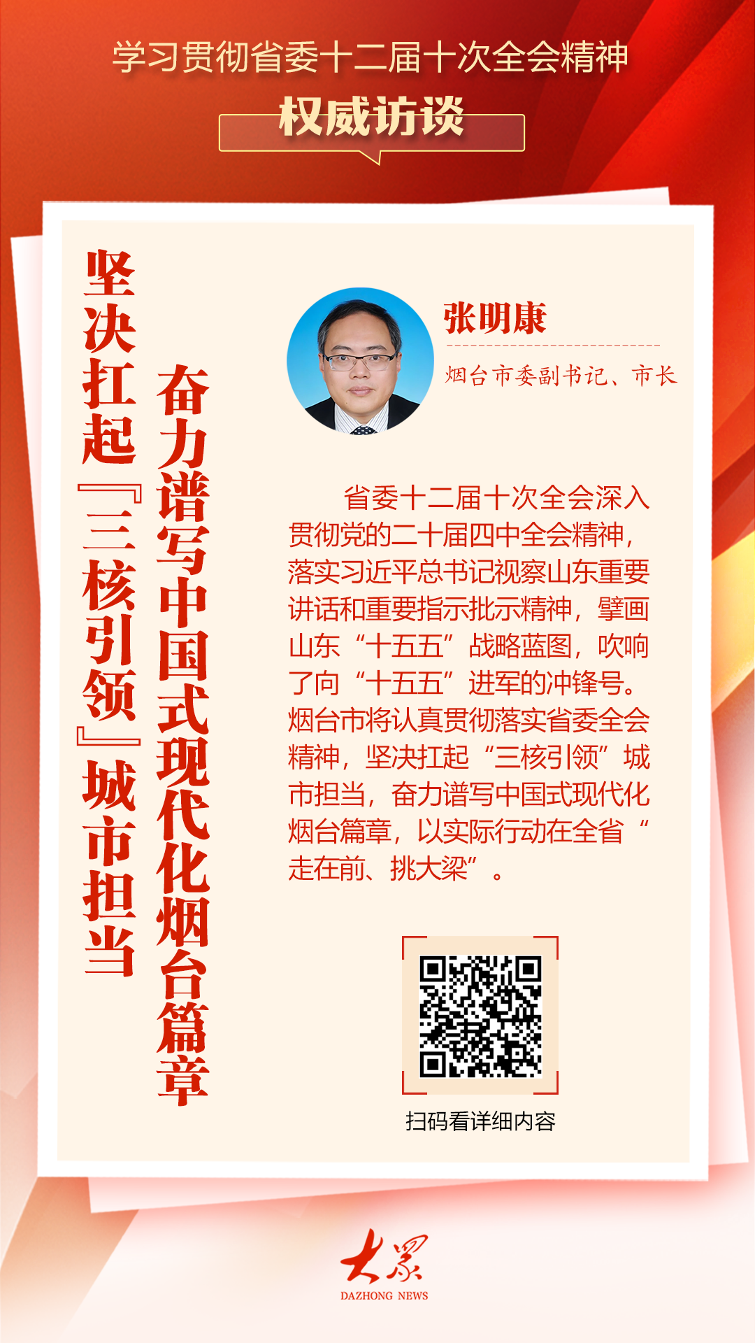 党的十二届十次大会深入贯彻党的二十届四中全会精神,贯彻落实习近平总书记视察山东重要讲话和重要批示精神,制定山东省“十五五”战略部署,发布“十五五”进展情况。烟台市将认真贯彻落实省委大会精神,坚决担负起建设“三核引领”城市的责任,努力谱写现代中国式烟台的篇章,以实际行动在全省“走在前列”。一是坚持坚决推进中国式现代化。建设低碳高质量绿色发展示范城市的目标坚定不移,坚持项目更好合作统筹制造业和服务业两个轮子,统筹科技创新和产业创新,统筹深化改革和扩大开放,统筹城市建设和区域振兴,统筹经济发展和改善民生,统筹发展和安全,提出强化我国第一个四边形发展“一流头条平”地位的项目。二是坚定战胜各种困难和挑战的信心。创造性地实施国家和地方一揽子稳增长政策措施,根据企业需求研究出台定向支持政策,提高政策针对性和有效性,激发企业经营活力。打造一流法治化国际化市场化营商环境,确保各项工作不间断、守信用、守信用。紧密结合,推动大企业双重发展和大中小项目持续建设,实现长期稳定高质量发展。三是完成发展目标任务的坚强决心。我们将贯彻落实全省经济社会发展专题会议的发展要求,全面开展“反思”,强化制造业对外贸压舱石、稳定器的支撑作用,努力扩大投资、促进消费,把控大项目建设,加大招商引资力度,坚决完成全年目标任务,圆满完成“十四五”。我们将理清思路,“向前看”,精心编制“十五五”规划,把规划坚持到底,一步一个脚印,努力实现“十五五”的良好开局。“五五”规划,进一步为新时代现代化强省建设贡献烟台力量。(摘 要:大众新闻记者 董钦)