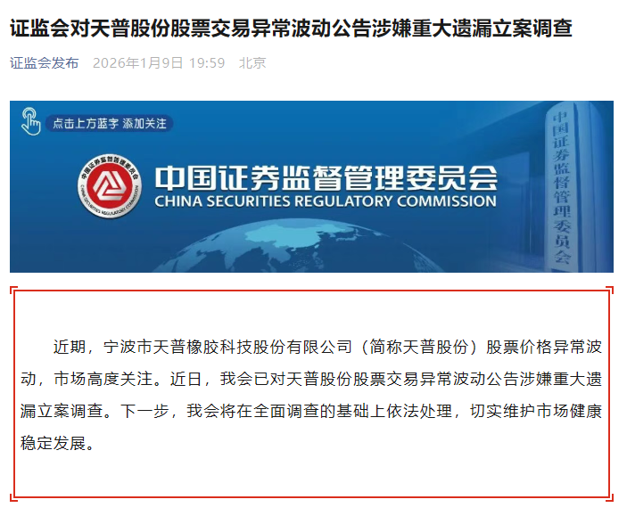 近日,宁波天普橡胶科技有限公司(简称天普)股价出现异常波动,引发市场关注。近日,证监会因涉嫌股票交易异常波动公告存在重大遗漏,对天普控股立案调查。下一步,我们将在深入研究的基础上,依法处理这一问题,切实维护市场健康稳定发展。
